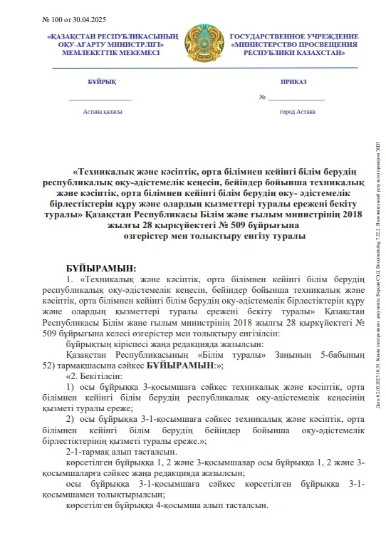 «Technical and vocational, post-secondary education the Republican educational and methodological Council, technicaleducational and methodological support of professional, post-secondary education» Regulations on establishment activities of associations of the Minister of Education and Science of the Republic of Kazakhstan dated 2018 September 28 No. 509 amendments and additions