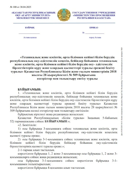 «Техникалық және кәсіптік, орта білімнен кейінгі білім берудің республикалық оқу-әдістемелік кеңесін, бейіндер бойынша техникалық және кәсіптік, орта білімнен кейінгі білім берудің оку- әдістемелік бірлестіктерін құру және олардың қызметтері туралы ережені бекіту туралы» Қазақстан Республикасы Білім және ғылым министрінің 2018 жылғы 28 қыркүйектегі № 509 бұйрығына өзгерістер мен толықтыру енгізу туралы